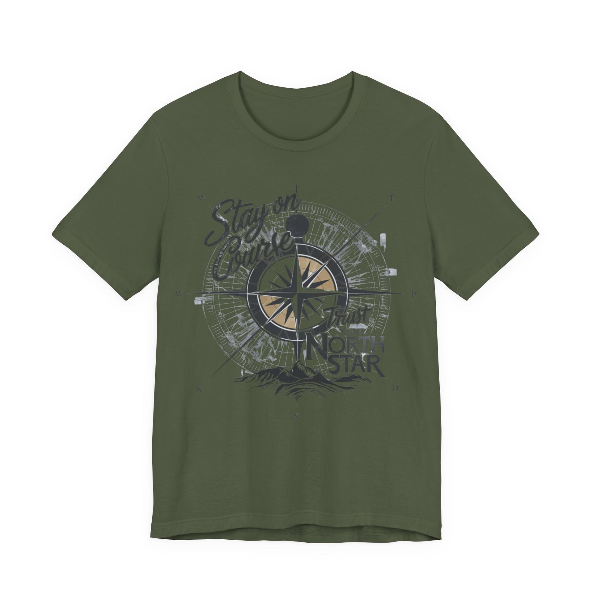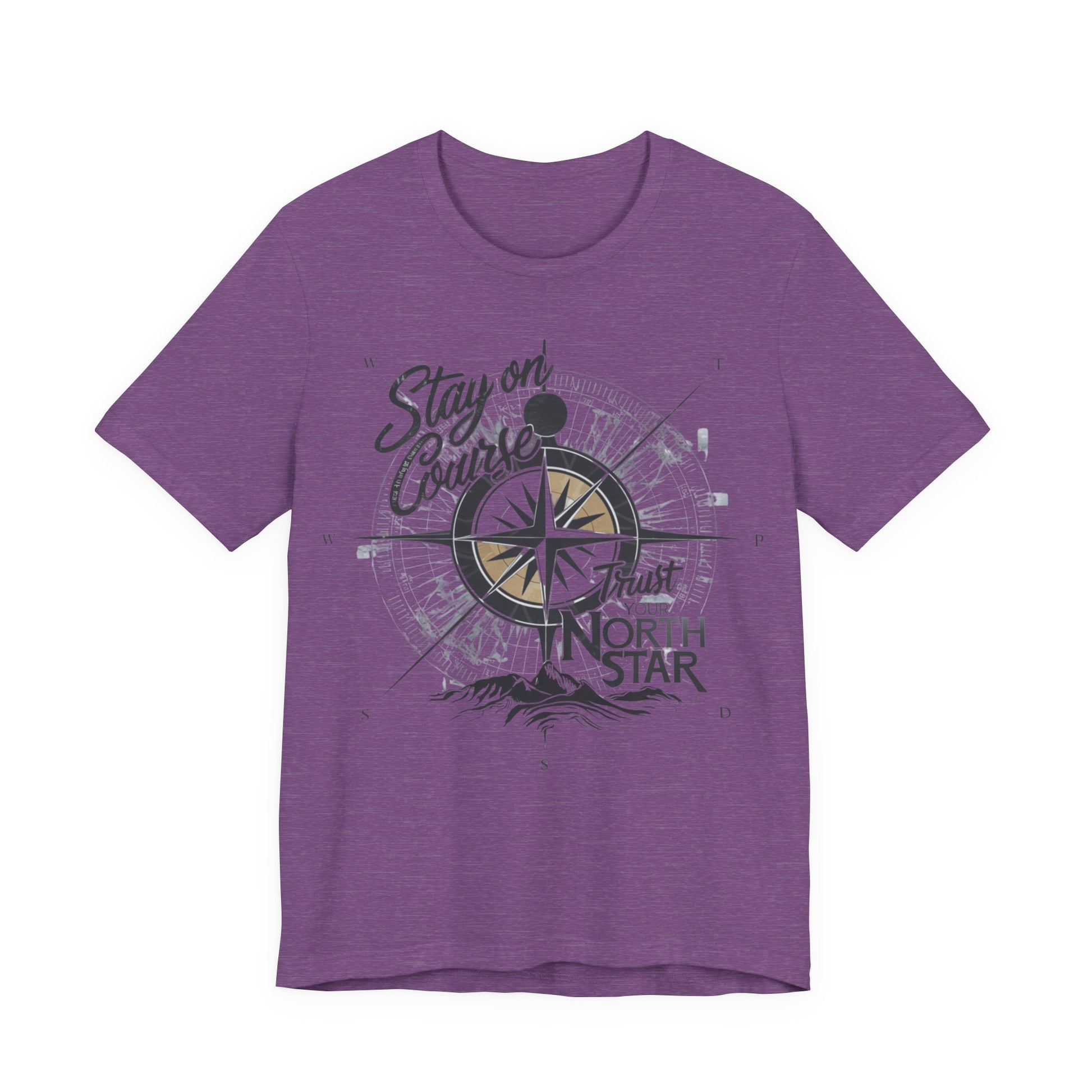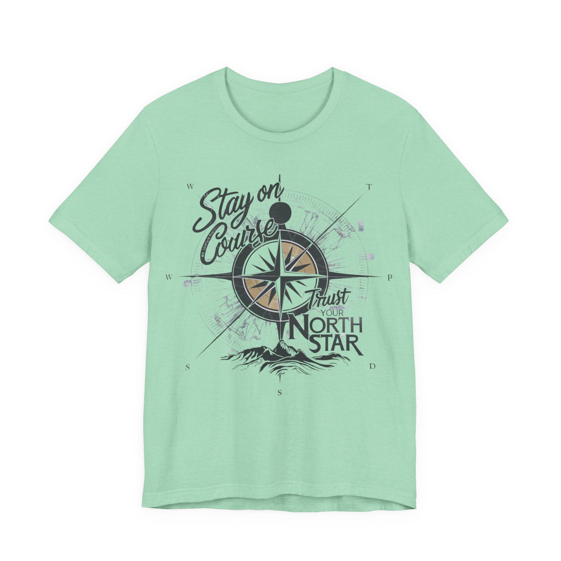 This T-Shirt features a visually inspiring design with the phrase "Stay on Course, Trust Your North Star." The design incorporates a compass and a bright, shining North Star symbolizing guidance and direction, evoking a sense of adventure, determination, and trust in one's path.