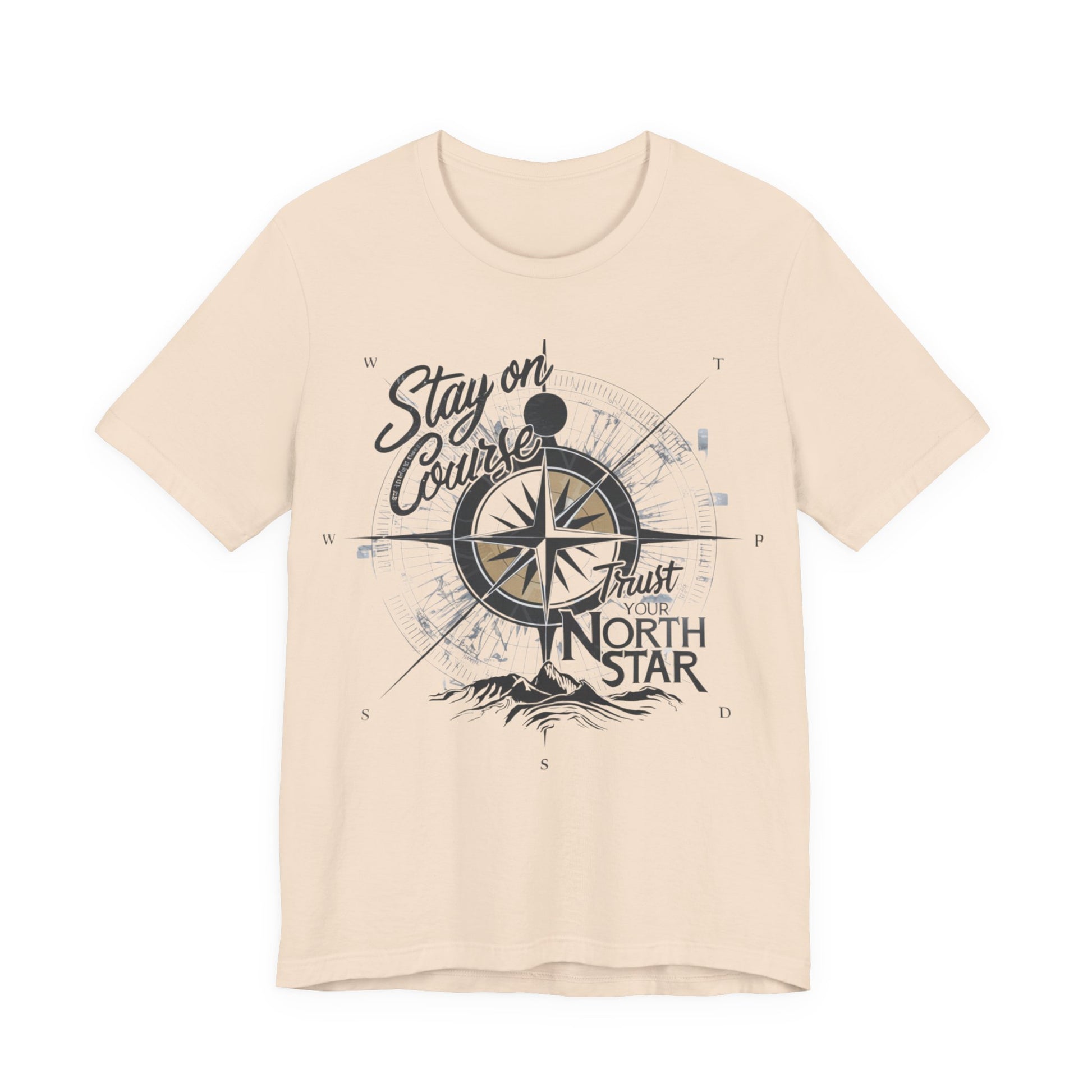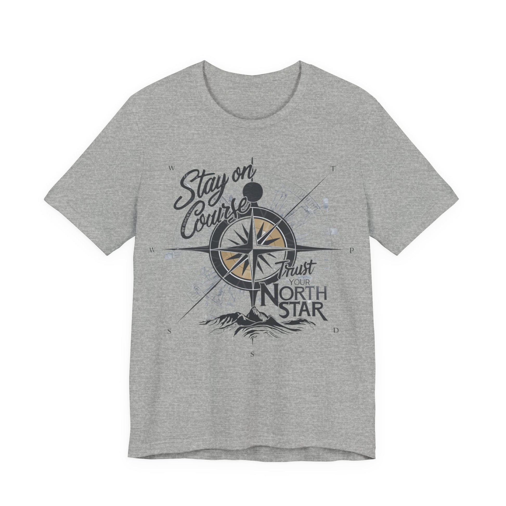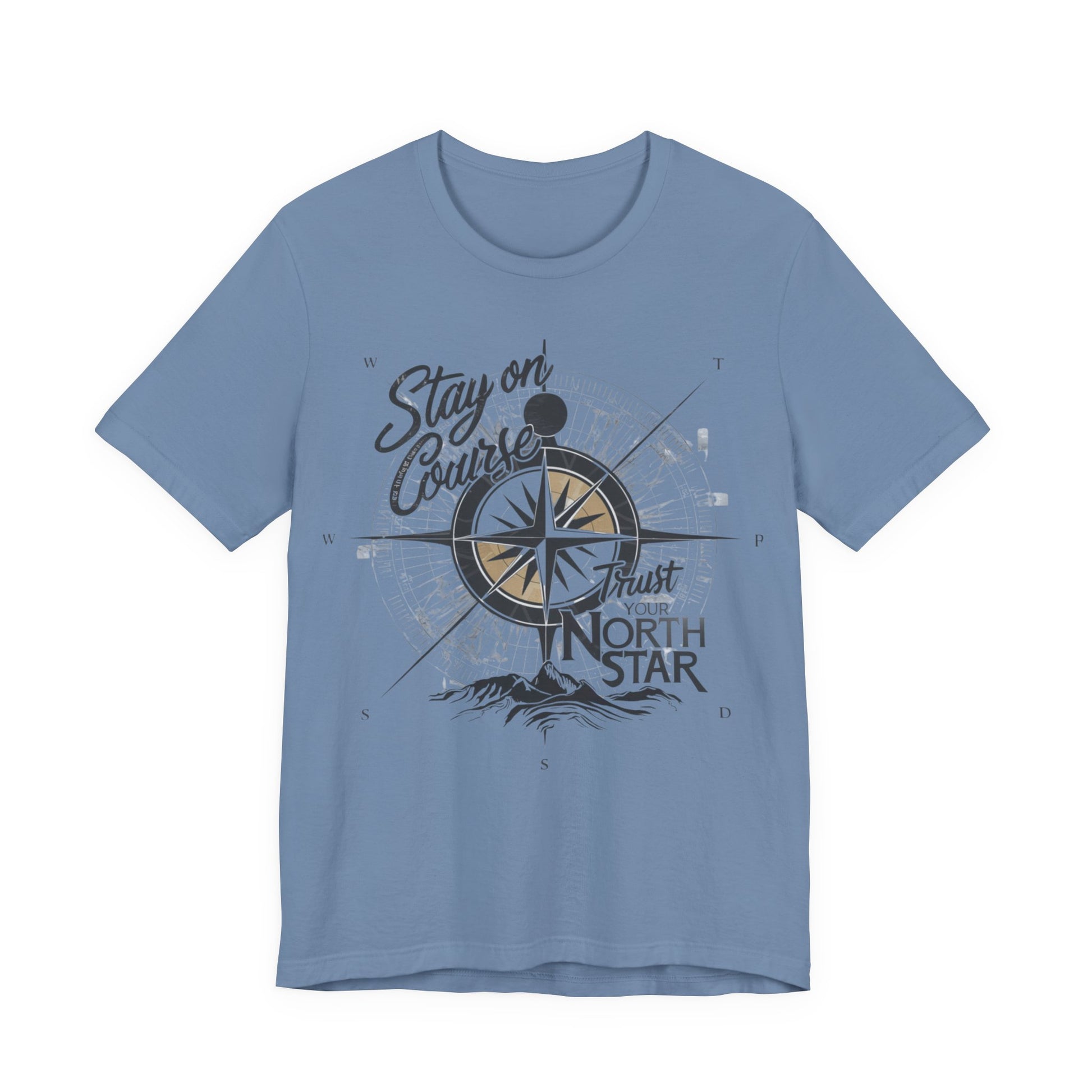 This T-Shirt features a visually inspiring design with the phrase "Stay on Course, Trust Your North Star." The design incorporates a compass and a bright, shining North Star symbolizing guidance and direction, evoking a sense of adventure, determination, and trust in one's path.