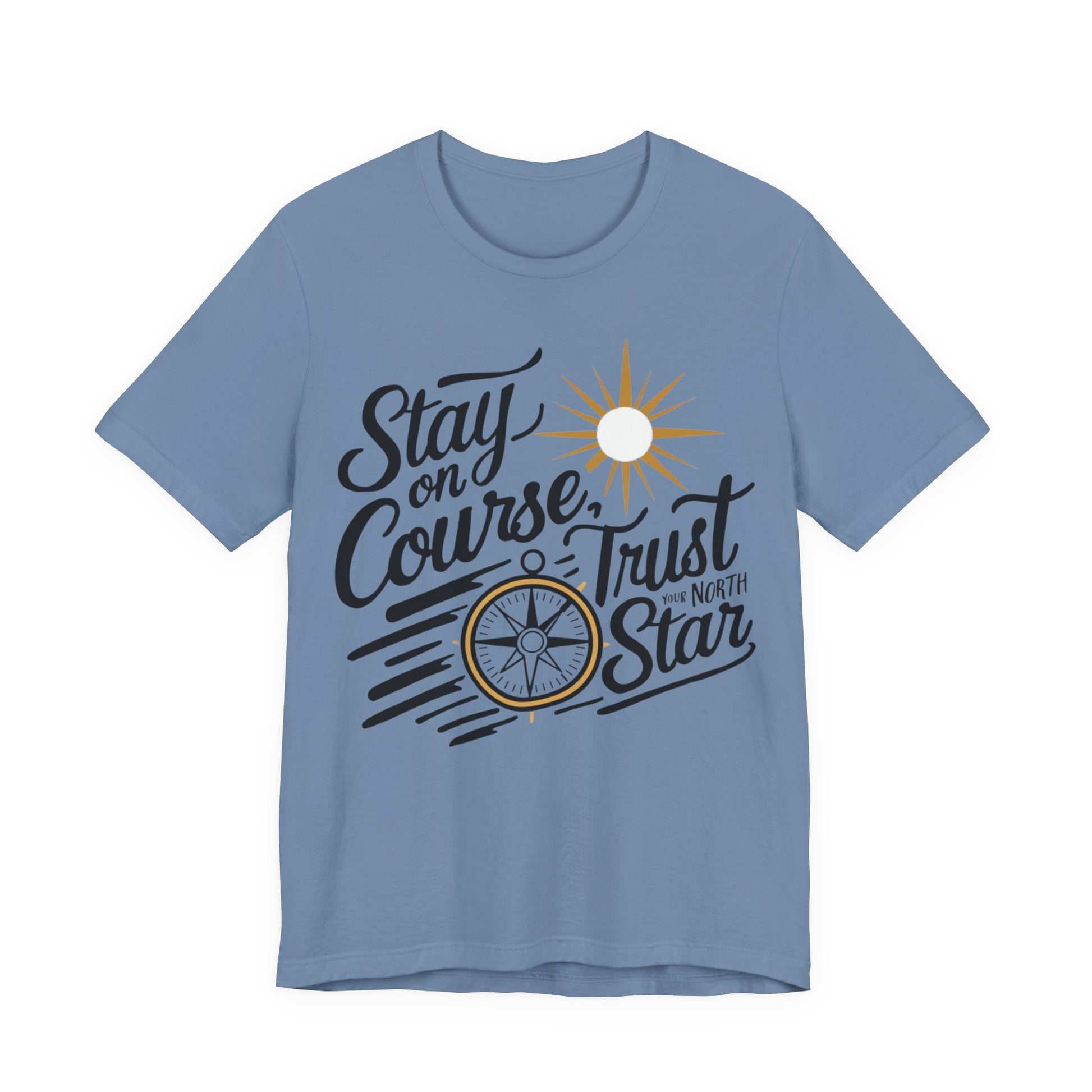 This T-Shirt features a visually inspiring design with the phrase "Stay on Course, Trust Your North Star." The design incorporates a compass and a bright, shining North Star symbolizing guidance and direction, evoking a sense of adventure, determination, and trust in one's path. The design is relevant for those seeking motivation, direction, and a reminder to trust their instincts. Perfect for outdoor enthusiasts, travelers, and those embarking on new journeys. Ideal for gifting during graduation, job promotions, and milestone celebrations.