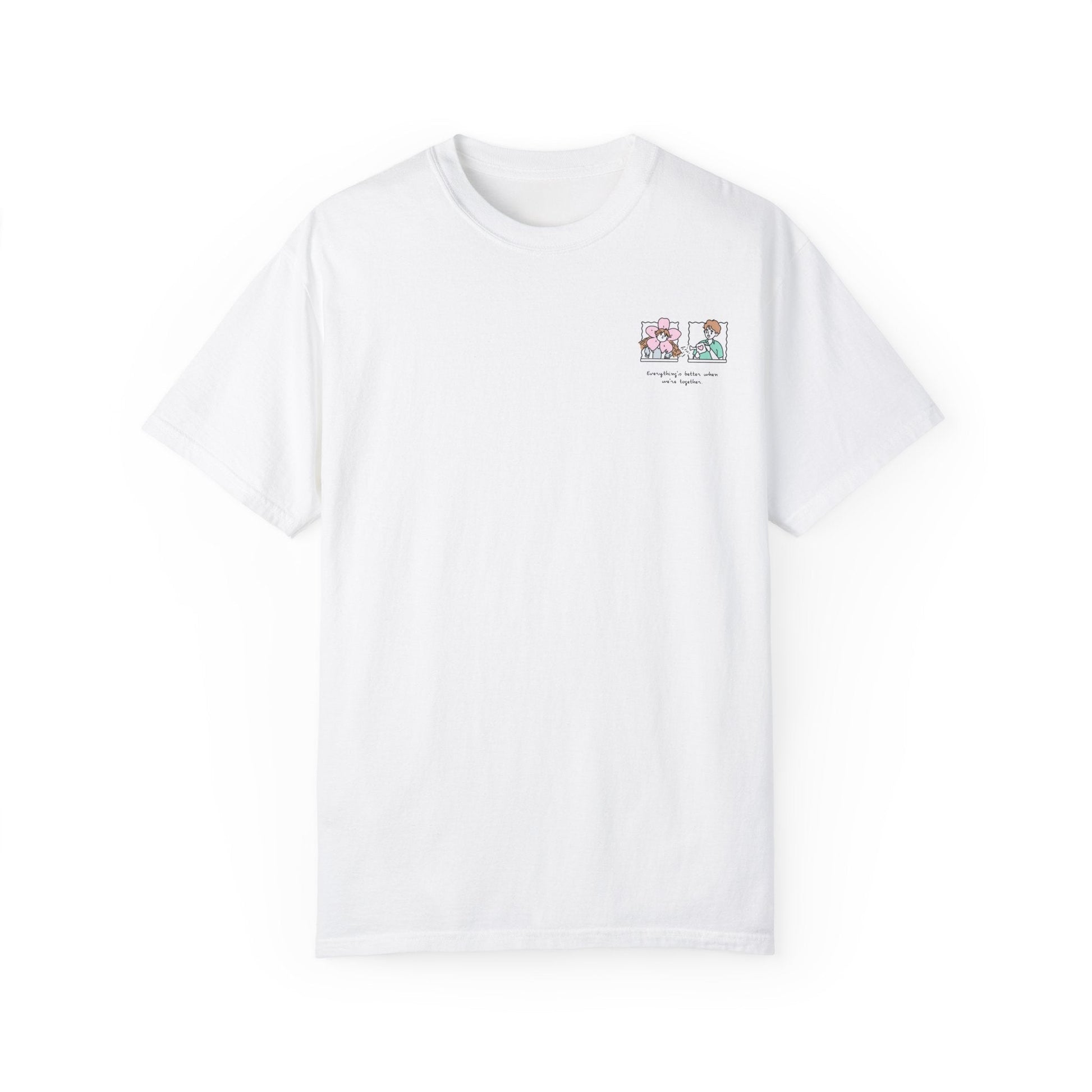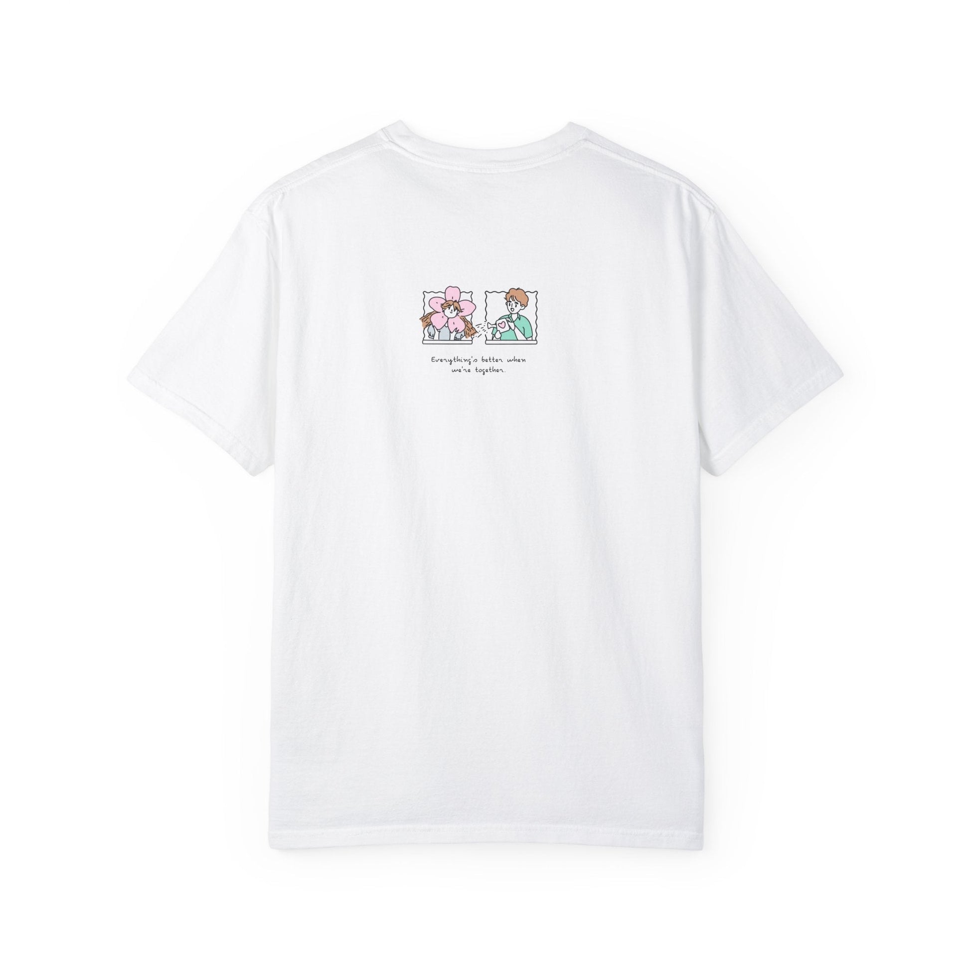 Celebrate the quiet magic of nurturing relationships with our "Growing Together" Illustrated T-Shirt. This tender design shows one partner as a sun-seeking flower and the other as a caretaker with a watering can – because real love isn’t just sparks, it’s showing up with your watering can every damn day.