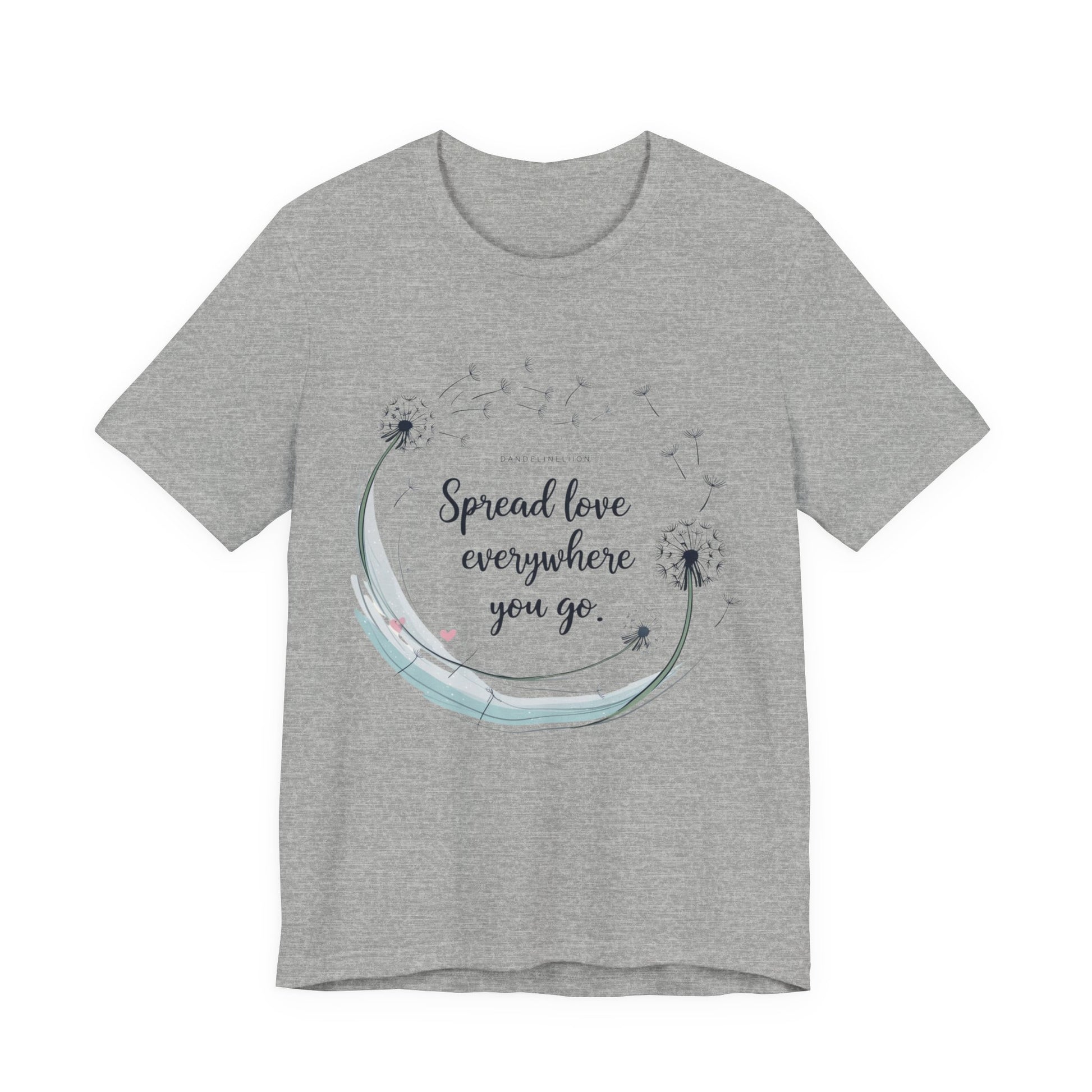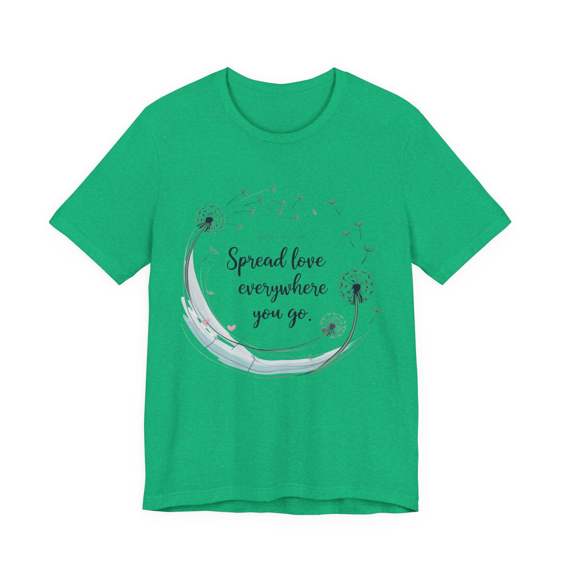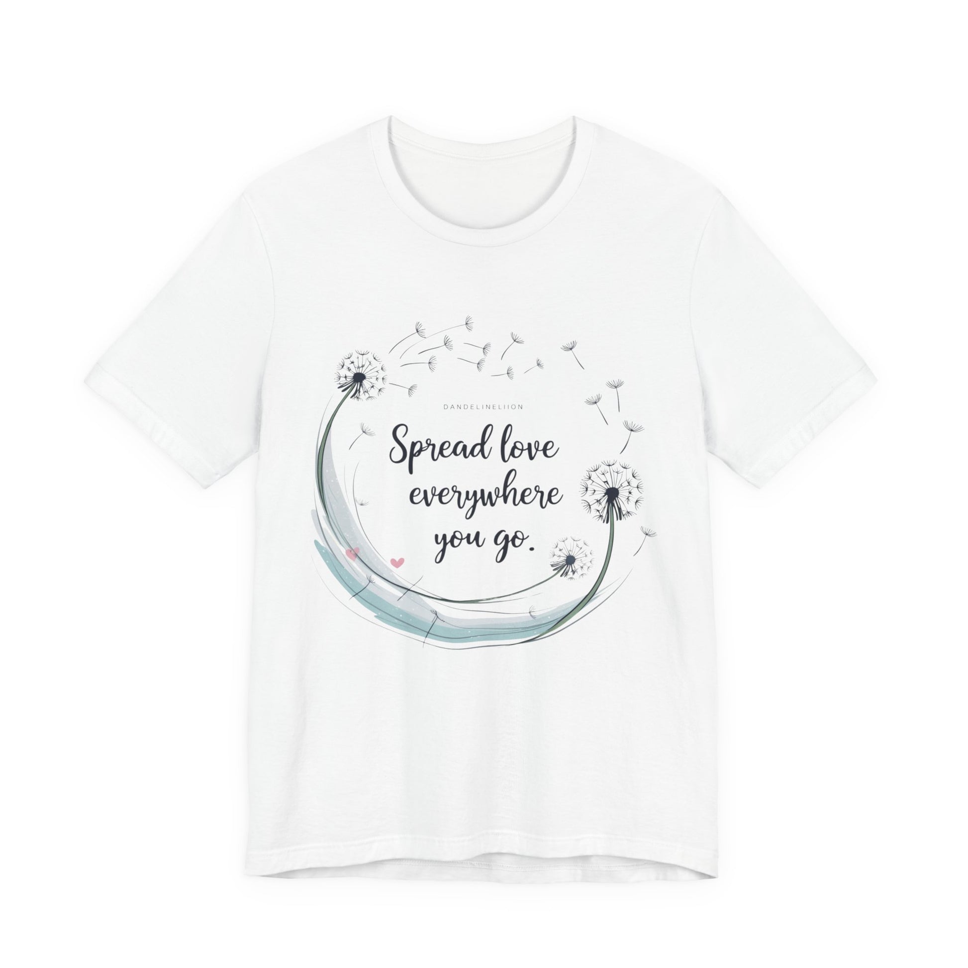 An uplifting T-Shirt design centered around the phrase "Spread Love Everywhere You Go" , featuring dandelions with seeds blowing in the wind symbolizing spreading love. The soft pastel colors and gentle swirling lines create a calming and positive vibe. Perfect for those who value spreading kindness and love, ideal for casual wear, and great for occasions like Valentine's Day or random acts of kindness.