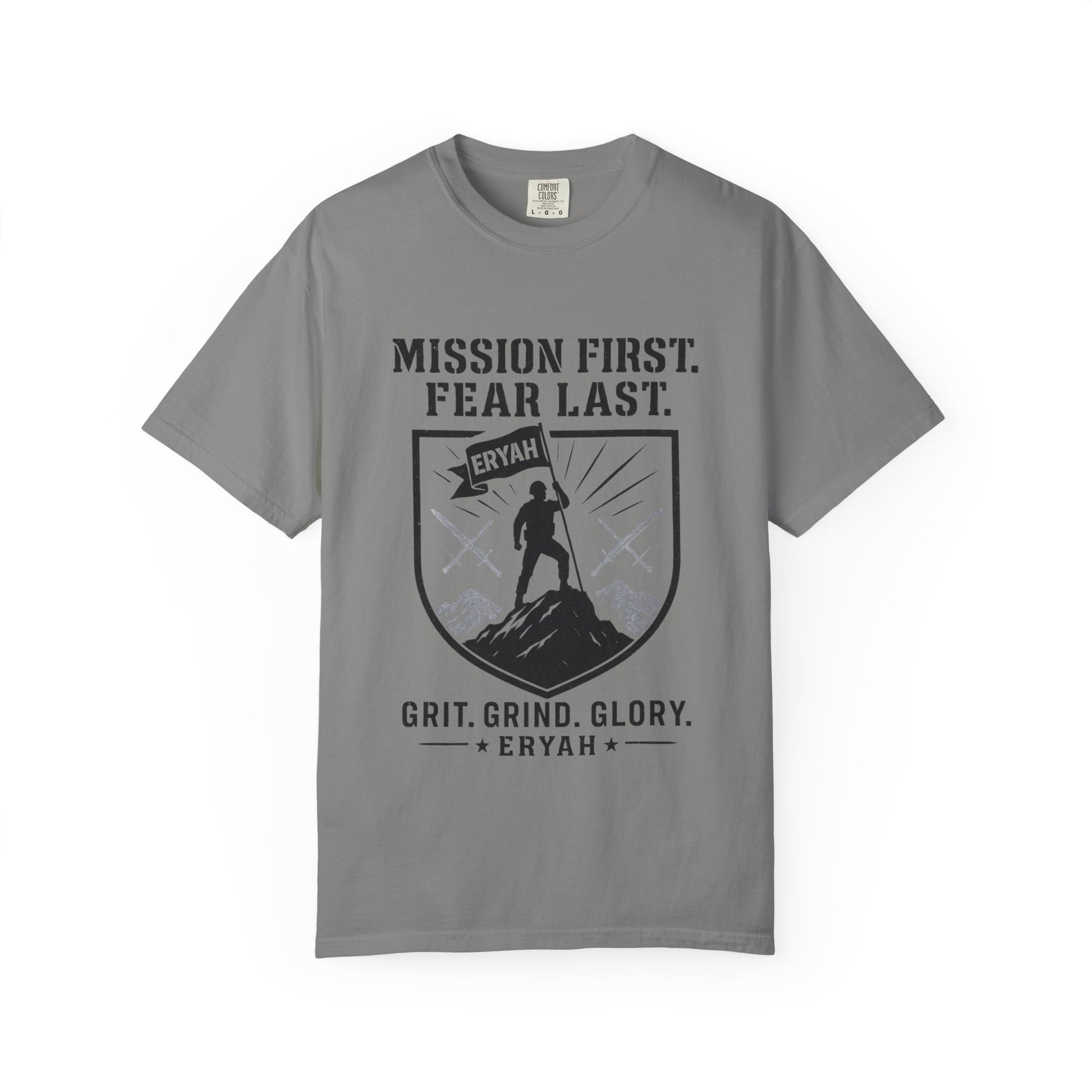 Stay mission-focused with this bold, battle-ready graphic tee from ERYAH. Featuring a distressed stencil font and powerful messaging—“MISSION FIRST. FEAR LAST.”—this design is made to inspire grit, courage, and unshakable resolve.