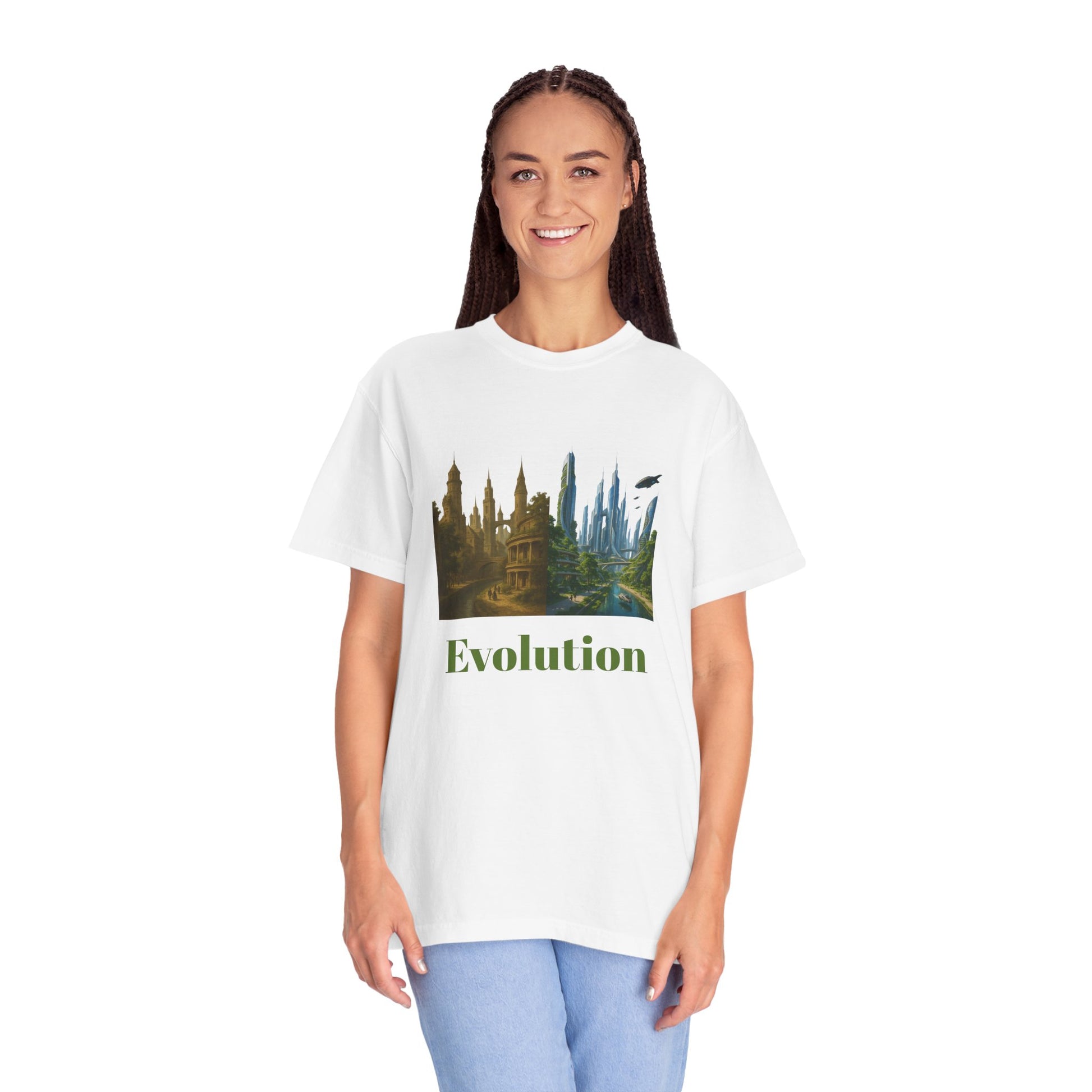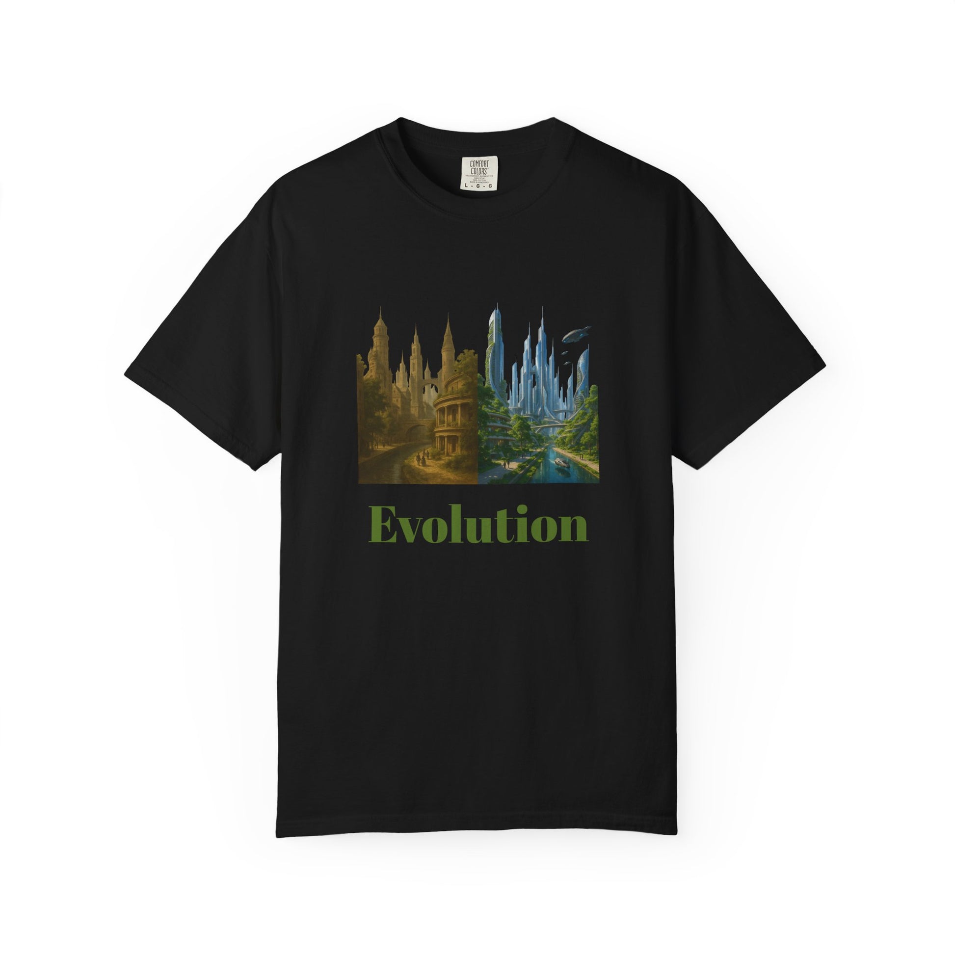 Wear a symbol of change with our Transformative EVOLUTION T-Shirt. This design masterfully depicts a reflective image, showcasing a fascinating juxtaposition of natural and man-made structures, all framed by the powerful word "EVOLUTION." It's a conversation starter that represents growth, adaptability, and the journey of transformation. Stand out with a tee that's as meaningful as it is stylish.