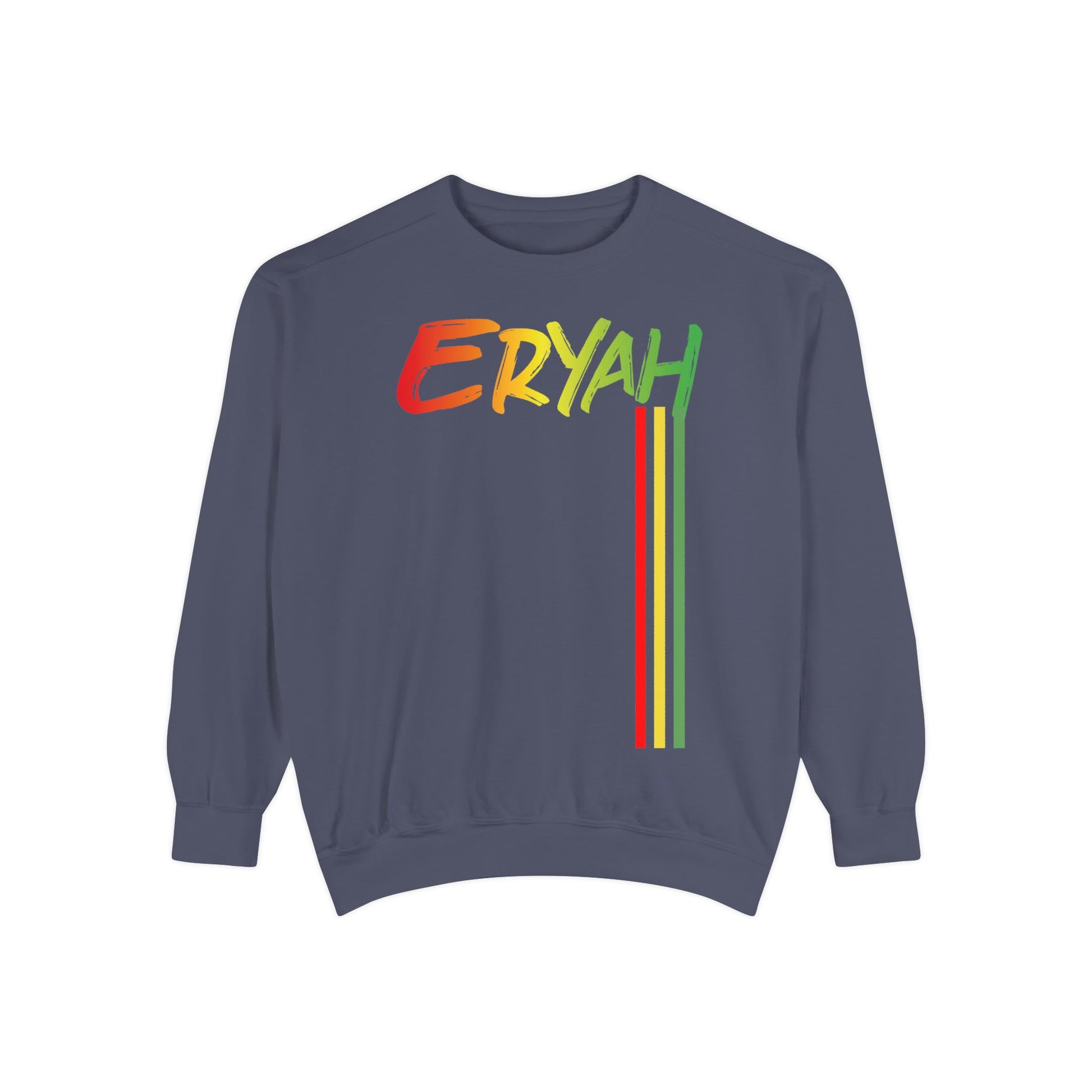 Channel those positive reggae rhythms with our Eryah Rasta Crewneck Sweatshirt! This effortlessly cool top features a bold "Eryah" logo in classic red, yellow, and green, accented by subtle stripe detailing in the same iconic hues.