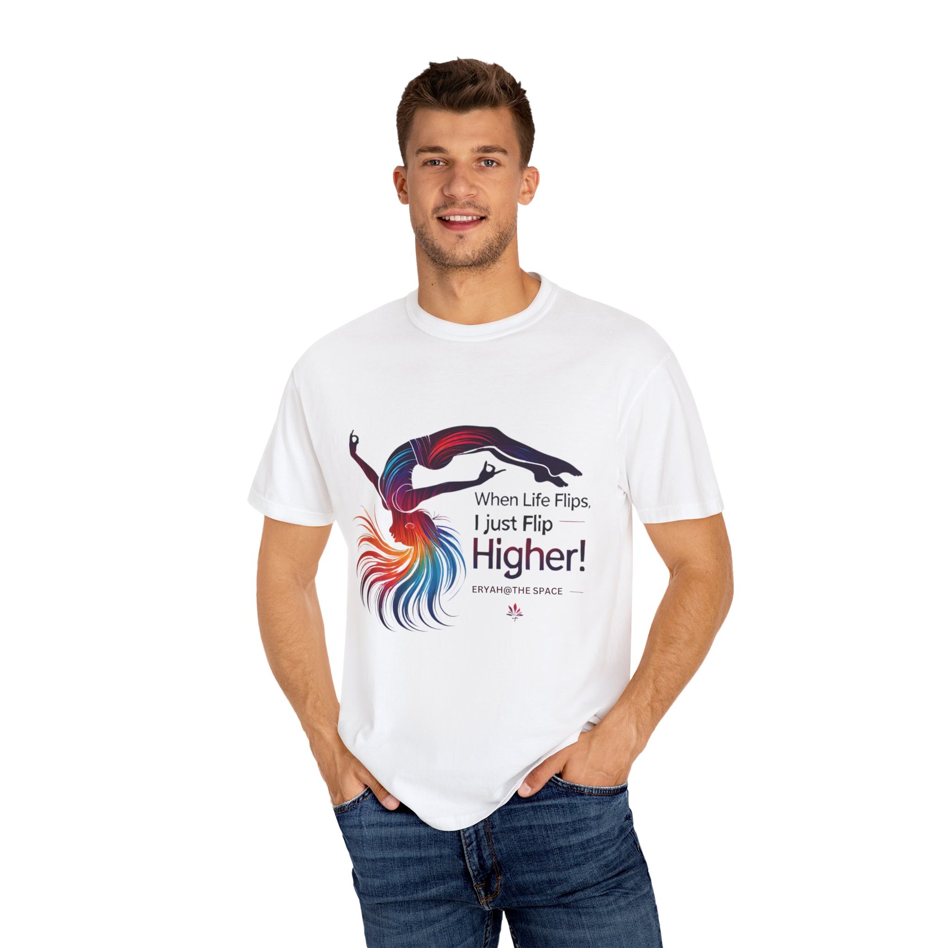 Channel resilience and movement with the "Flip Higher Tee." This minimalist yet powerful design features a graceful figure in mid-flip, her flowing hair transitioning through earthy tones to symbolize strength, balance, and transformation. The bold message, “When Life Flips, I just Flip Higher,” inspires confidence and perseverance with every wear. Perfect for yogis, dancers, athletes, or anyone navigating life with grit and grace.